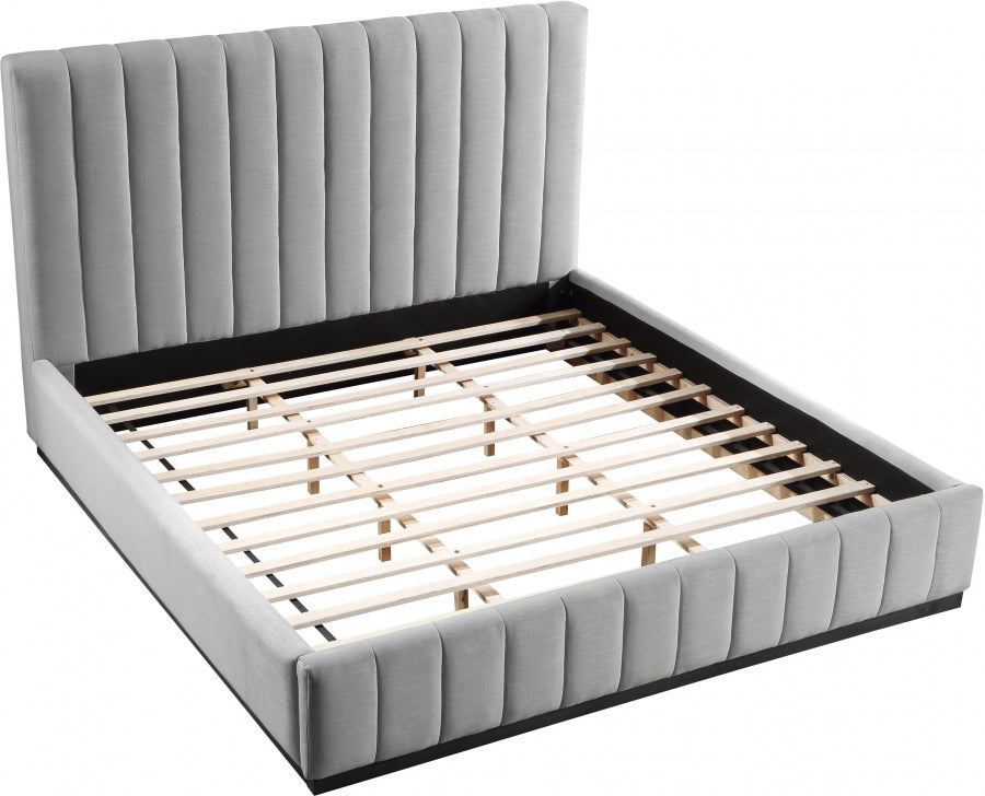 Remake your bedroom in an instant with this Lucia linen textured fabric bed. Upholstered in soft-to-the-touch grey linen textured fabric on its headboard, footboard, and side rails, this handsome full bed has a high headboard for an attention-demanding look in your room. Channel tufting on the headboard and footboard add to its aesthetic beauty while providing texture and dimension. The bed rests on a black-finished base that's crafted from solid wood for lasting beauty and durability.