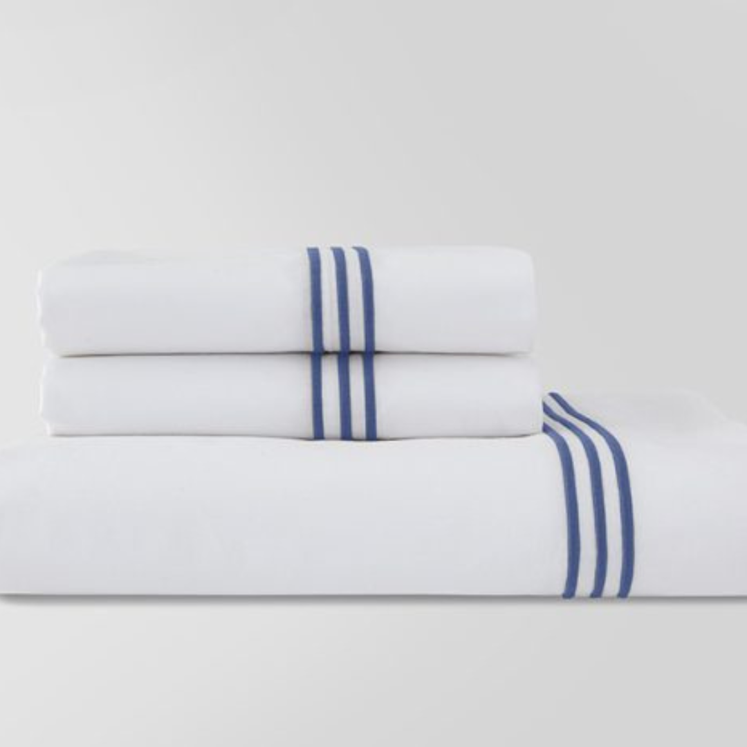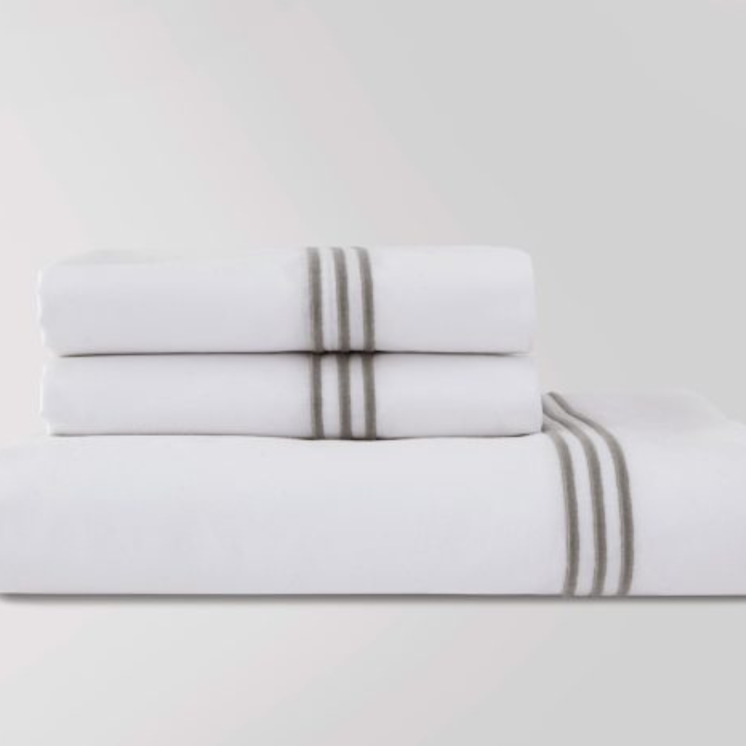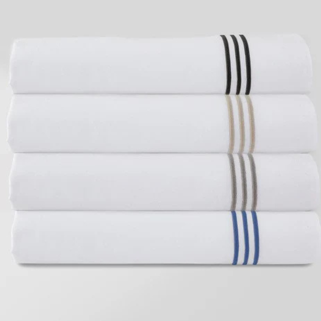 The Madison Sheet Set features a Triple Row Satin Embroidery which coordinates perfectly with the Madison Duvet Set. 400 TC, 100% Cotton Sateen, Long Staple Single Thread. Embroidery available in either Ocean Blue, Taupe, Gray, or Black. Made in Portugal.