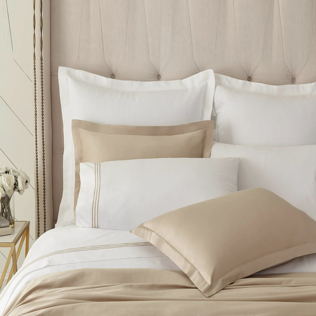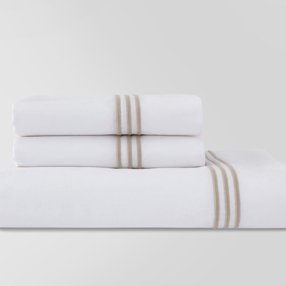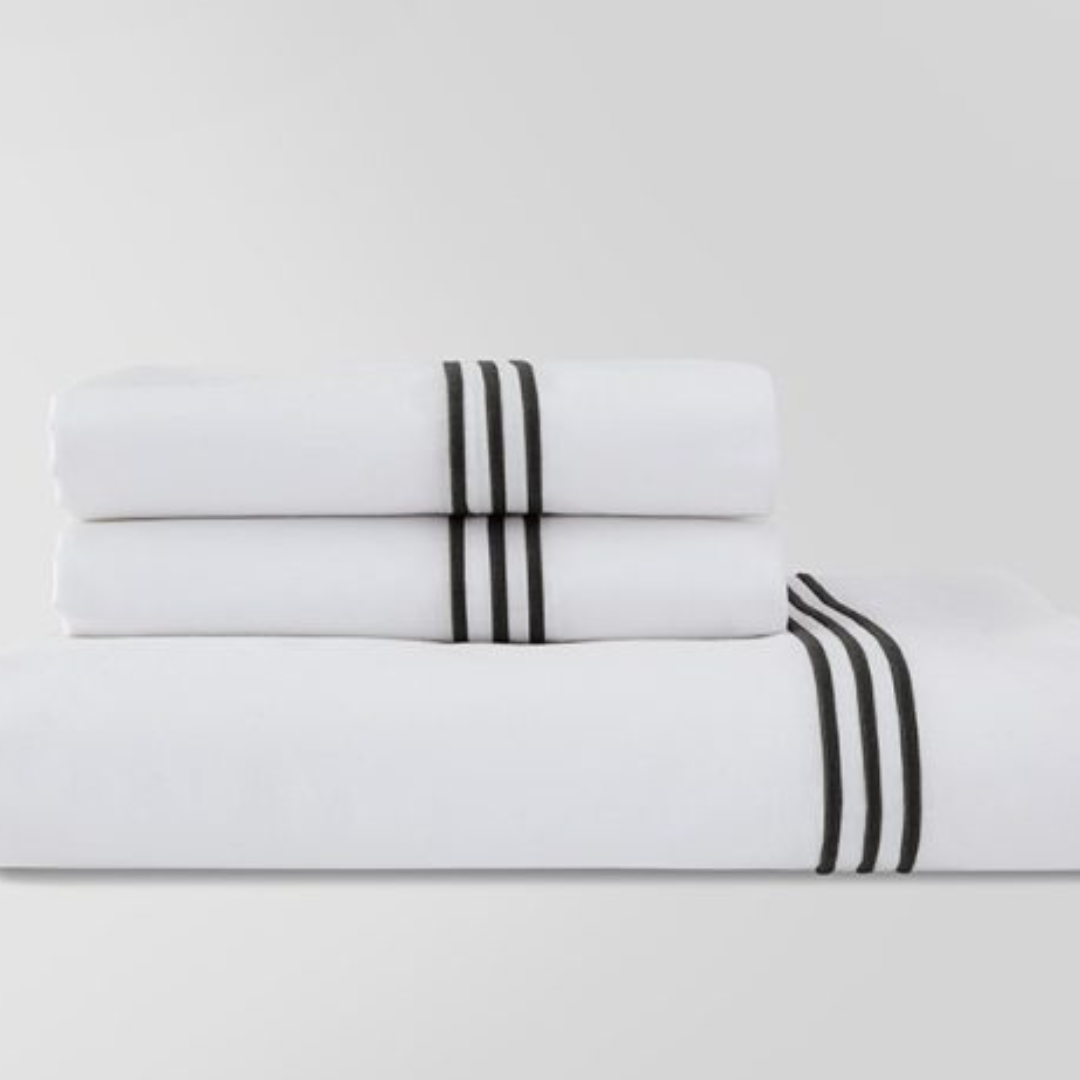 The Madison Sheet Set features a Triple Row Satin Embroidery which coordinates perfectly with the Madison Duvet Set. 400 TC, 100% Cotton Sateen, Long Staple Single Thread. Embroidery available in either Ocean Blue, Taupe, Gray, or Black. Made in Portugal.