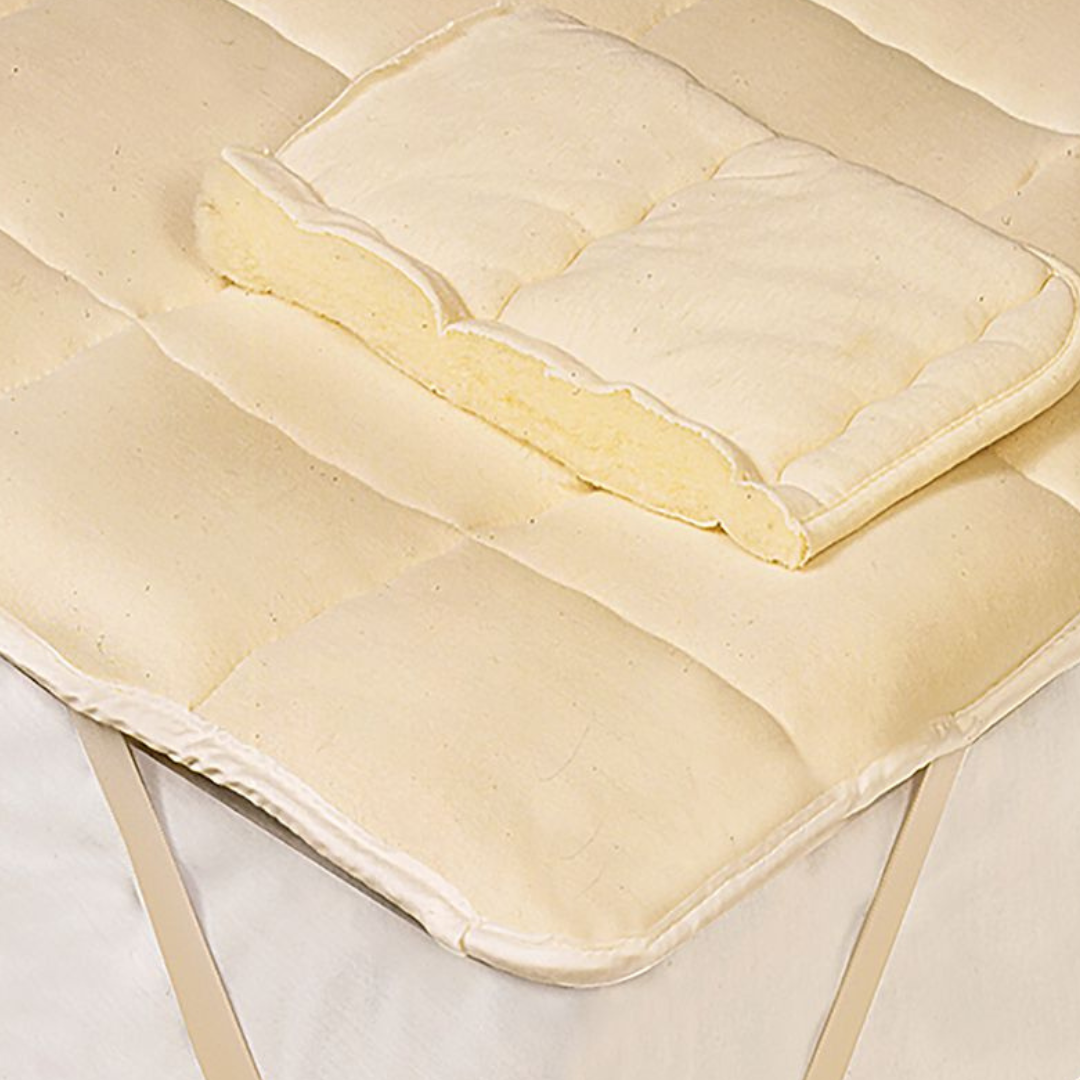 100% pure Merino Wool filling with a fiber proof 100% natural cotton jersey cover with corner elastic anchor bands. This pad cushions the body. Wool has exceptional wicking ability keeping you dry and making it a perfect pad for year-round use. Wool is naturally fire retardant. The pure wool is obtained only from free range sheep. Dry Clean.